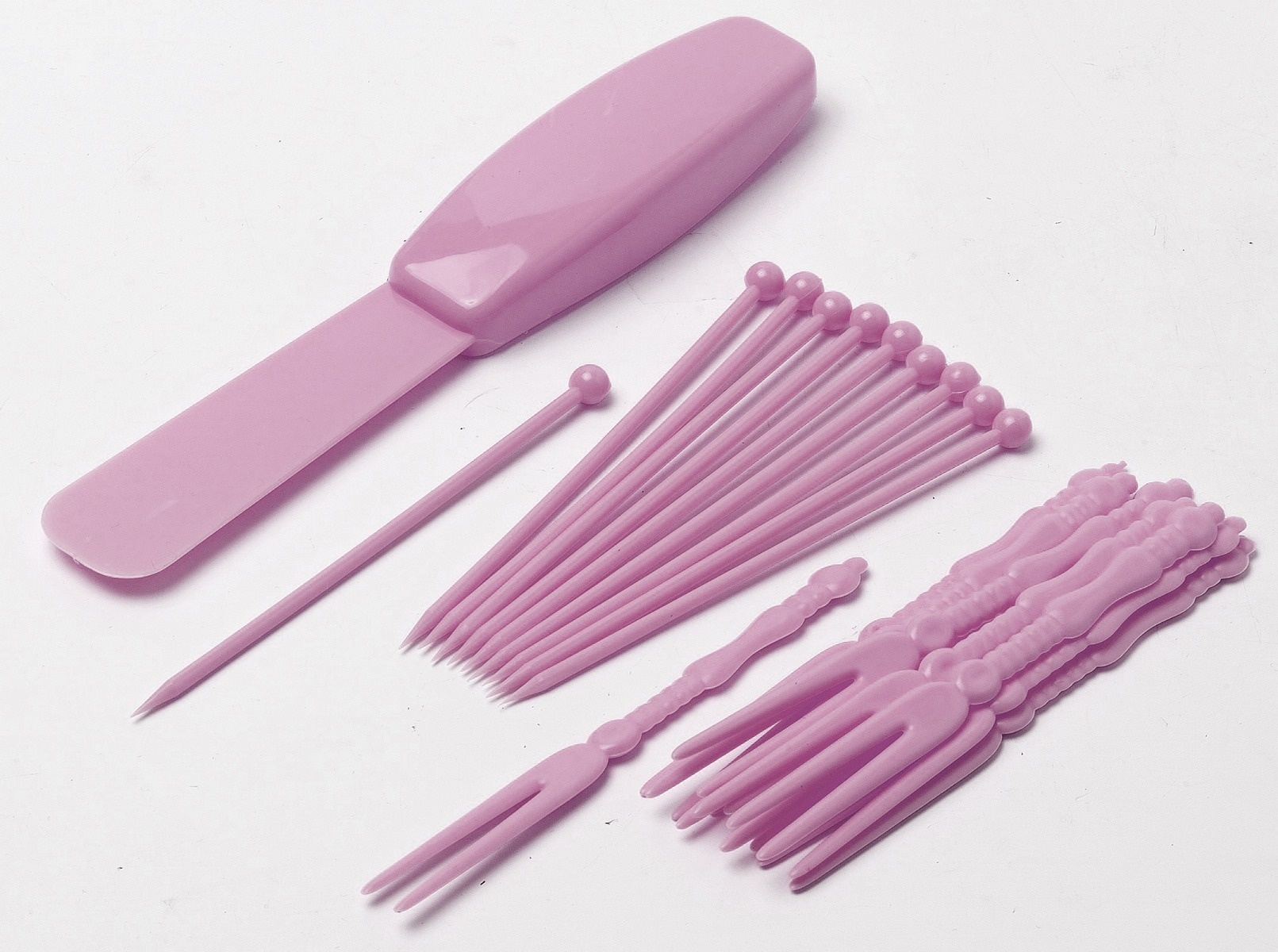 • Mit 10 Kunststoff Spießen, 10 Gabeln und 1 Spatel