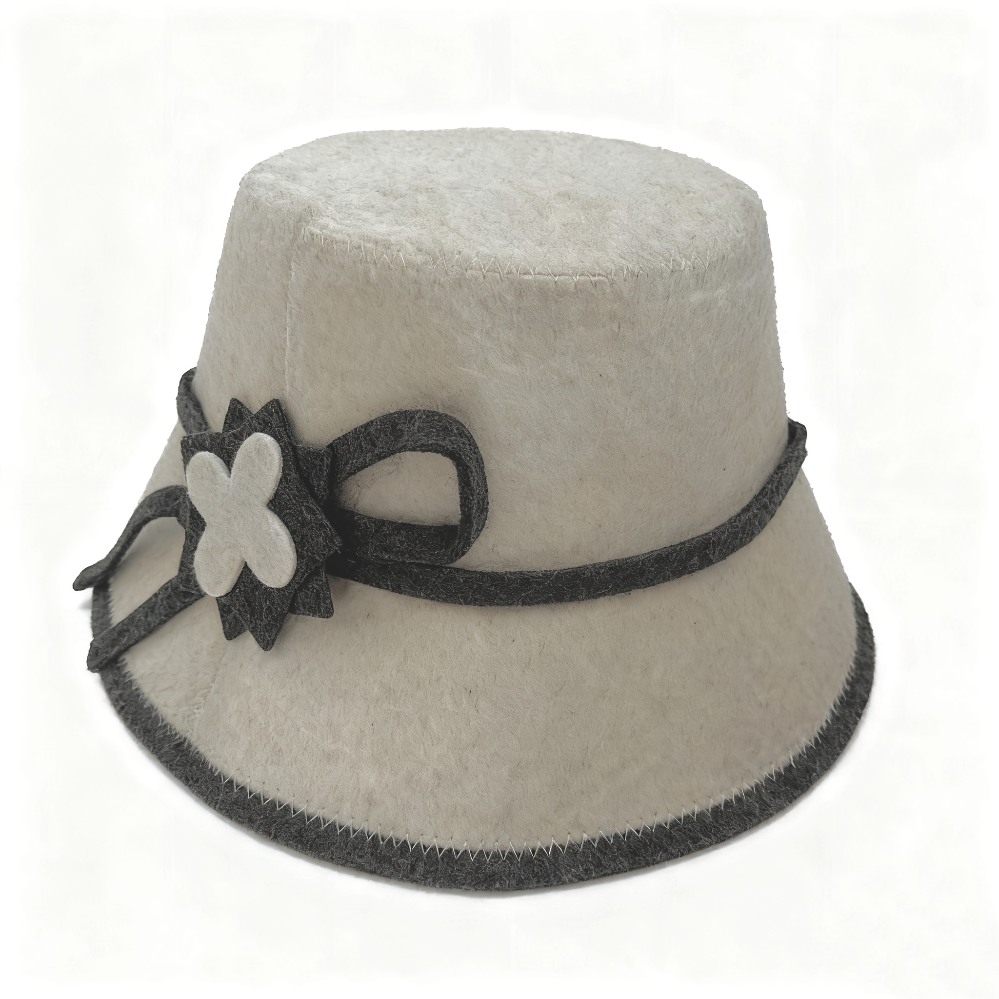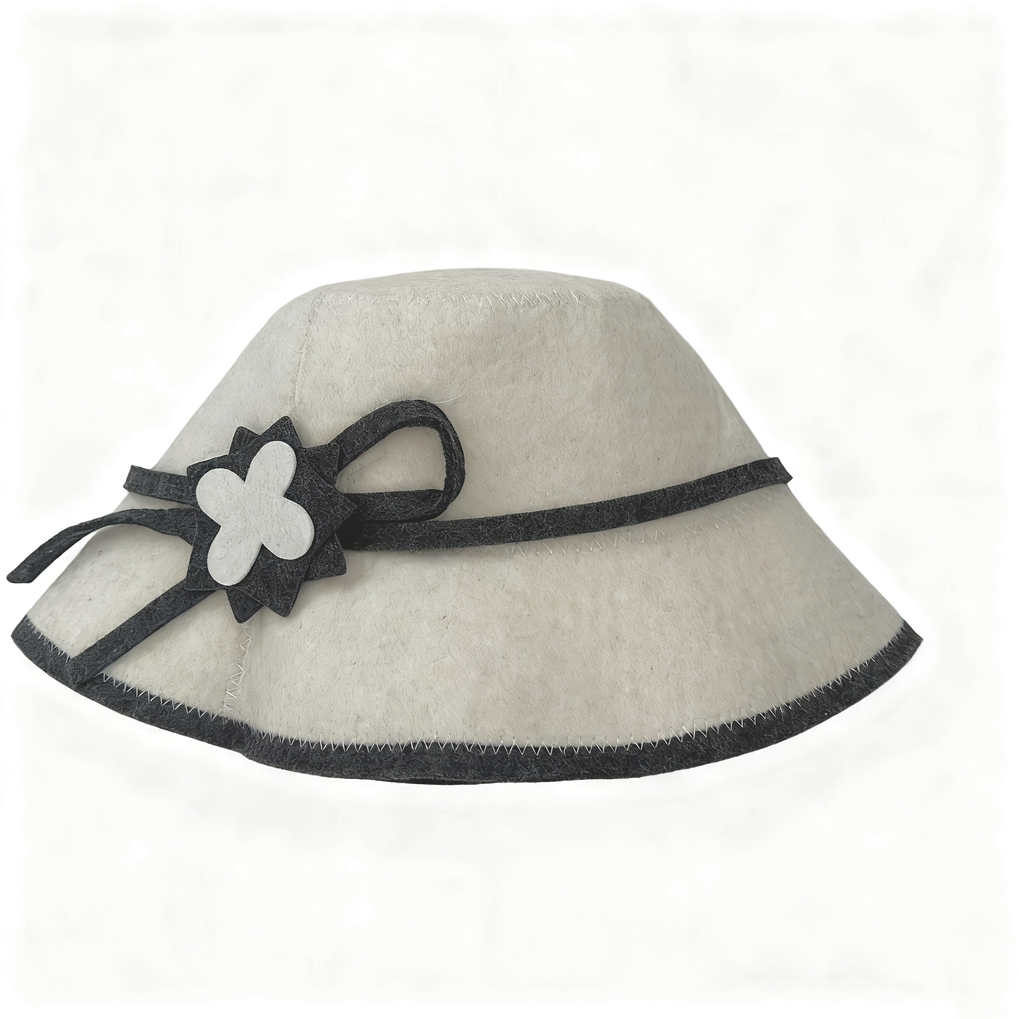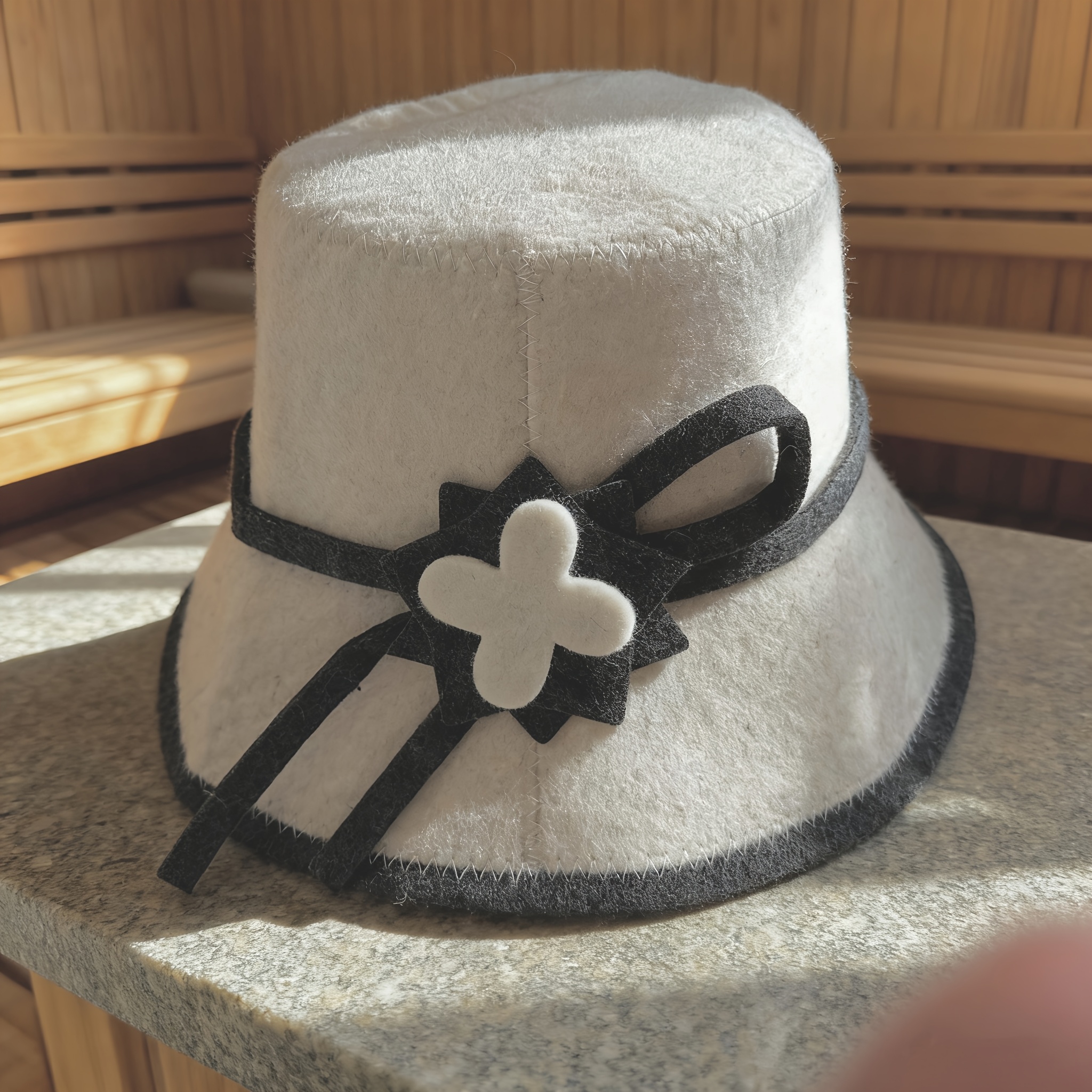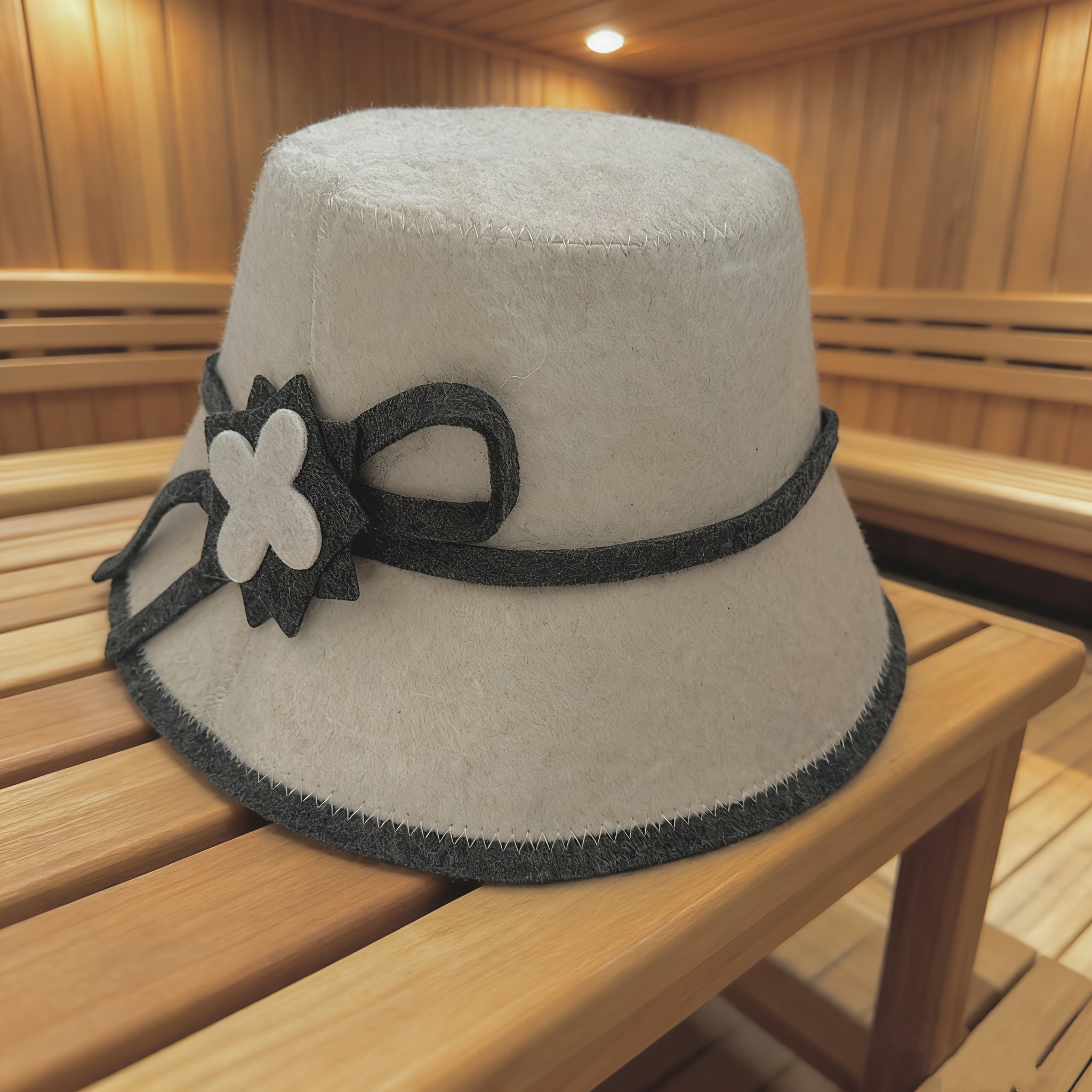 "Saunahut, Filzbadehut, Saunamütze aus Wollfilz weiss mit Blume"