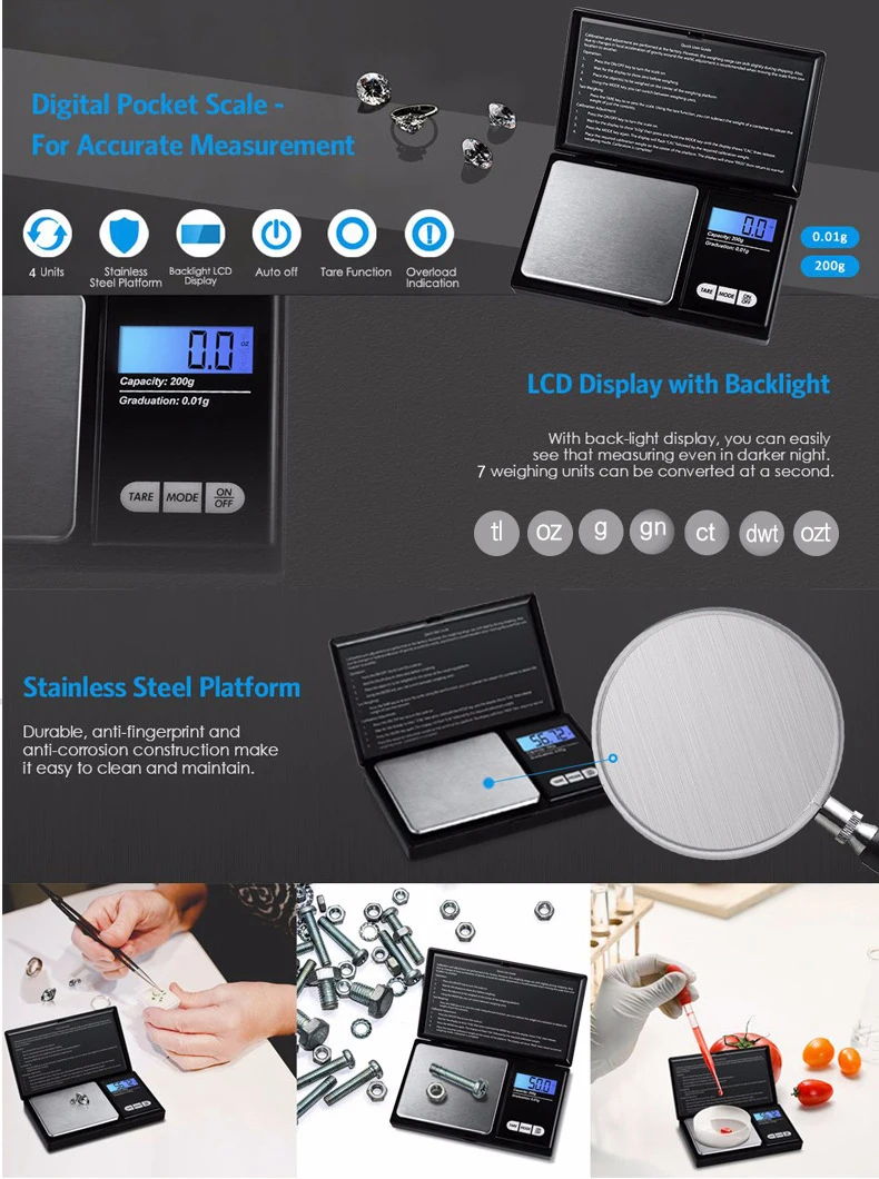 - 1000 g Mini-Taschenwaage - Abstufung: 0,1 g - 7 verschiedene Gewichtseinheiten: g / gn / ct / tl / dwtt / ozt / oz - LCD-Bildschirm, blaue Hintergrundbeleuchtung, wodurch Messdaten auf einen Blick klar sind - Skalenoberfläche aus gebürstetem Edelstahl, hochwertiger Guss - Kompakter und praktischer Wiegtisch: Wenn kleine Gegenstände wie Schmuck auf der Waage platziert werden, kann das Gewicht leicht gemessen werden, was ihn tragbar und praktisch macht - Farbe: Schwarz - Stromversorgung: 2x1,5 V AAA-Batterie (Batterie nicht im Lieferumfang enthalten)