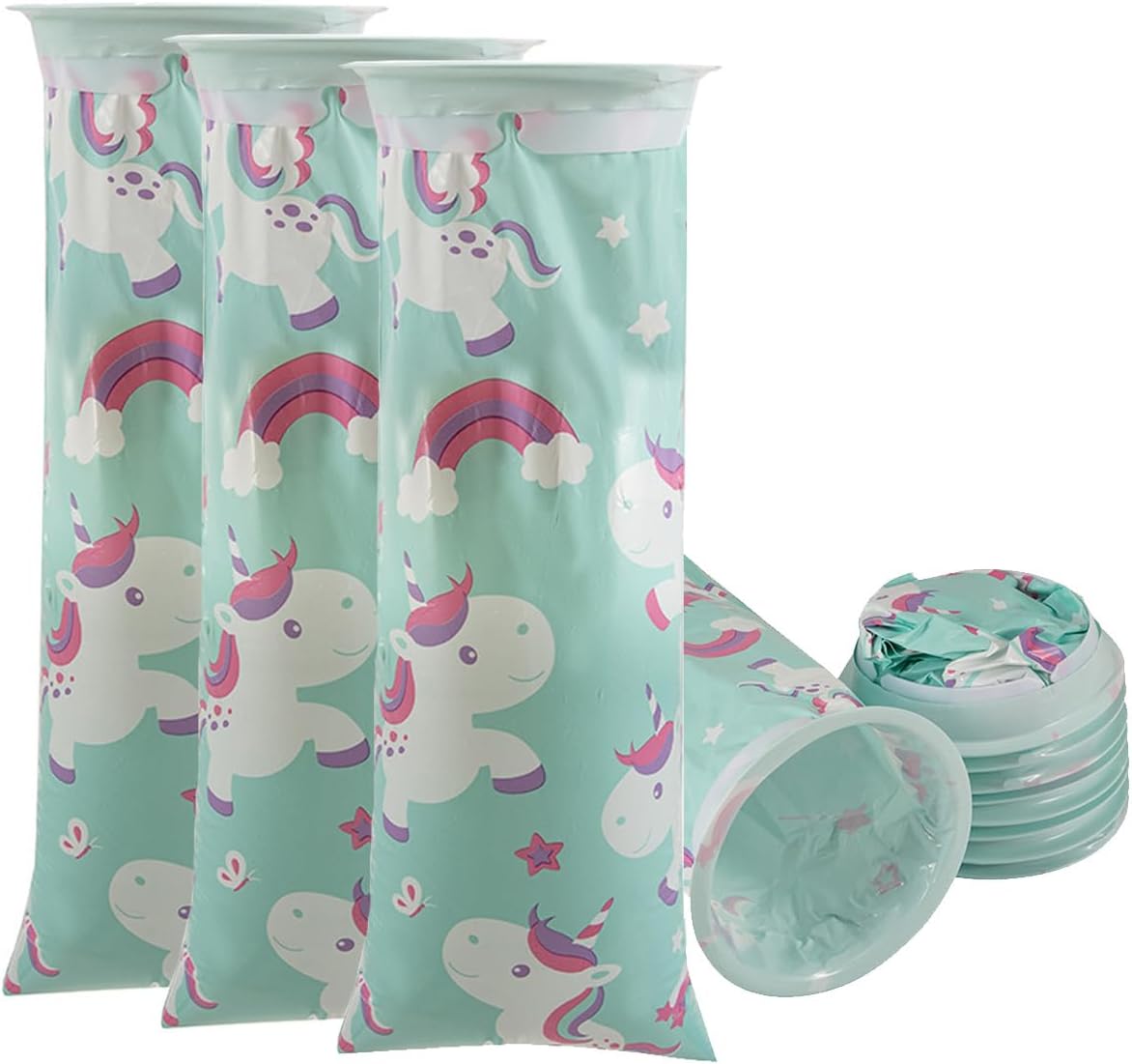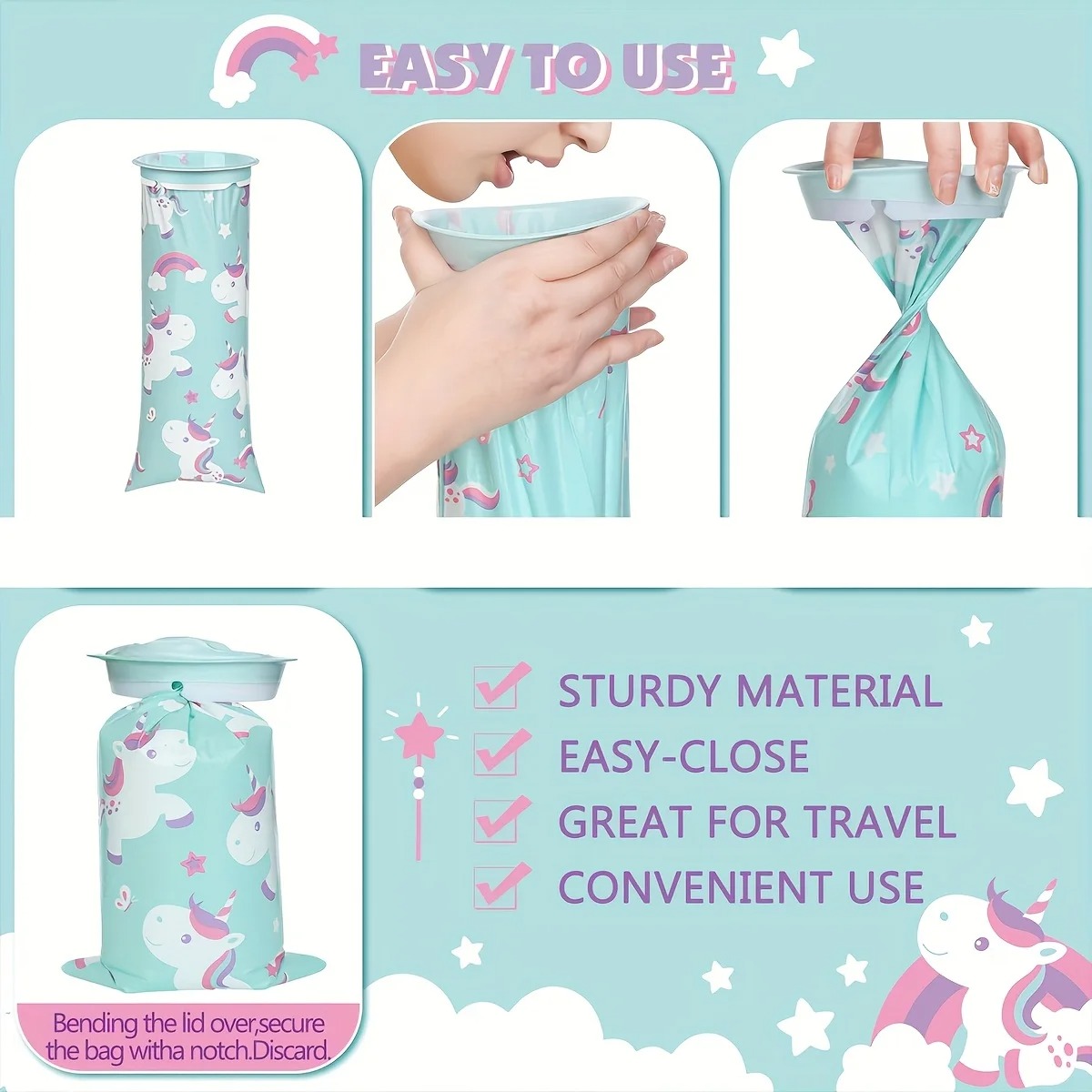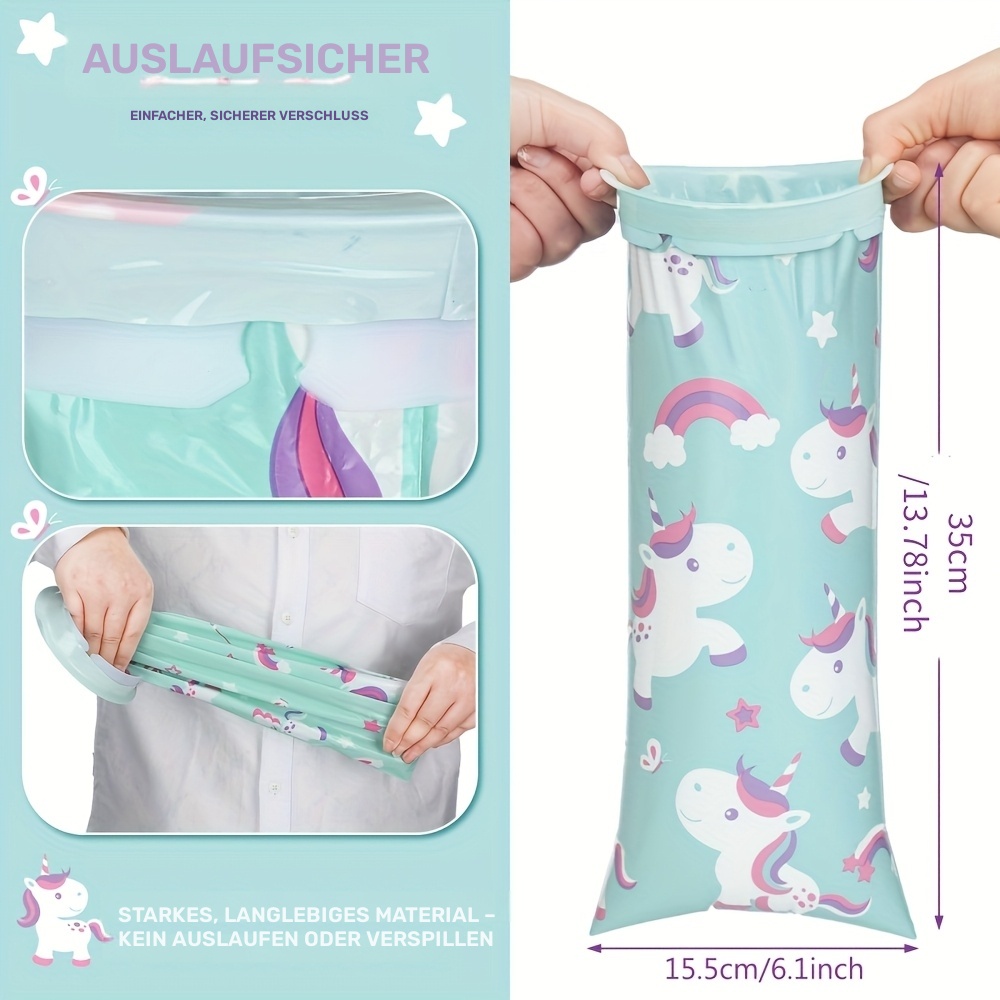 Die Einweg-Kotztüten im praktischen 6er-Pack süssem Einhorn-Motiv sind perfekt für unterwegs geeignet – ob auf Reisen, im Auto, Flugzeug oder Bus. Das robuste und widerstandsfähige Material sorgt dafür, dass sie zuverlässig dicht halten und kein Auslaufen möglich ist. Die Beutel lassen sich einfach öffnen und nach Gebrauch sicher sowie hygienisch verschliessen.
