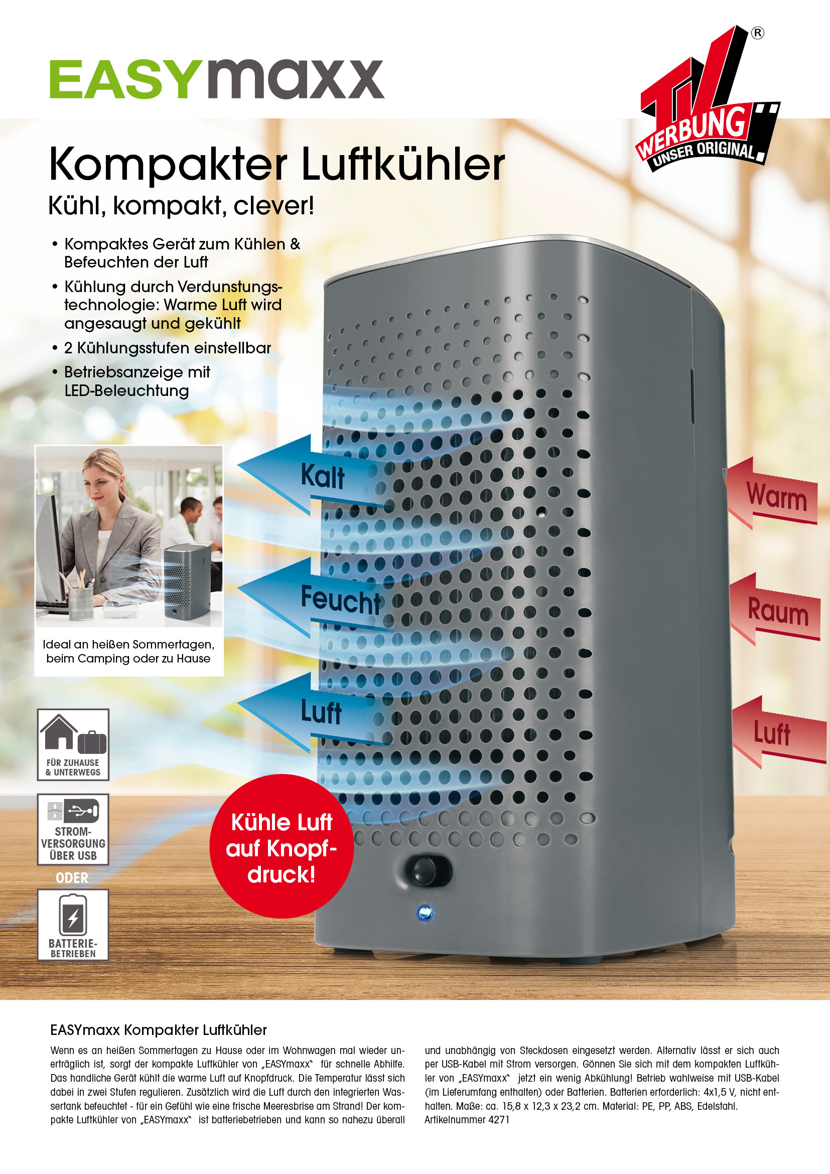 Wenn es an heißen Sommertagen zu Hause oder im Wohnwagen mal wieder unerträglich ist, sorgt der kompakte Luftkühler von "EASYmaxx" für schnelle Abhilfe. Das handliche Gerät kühlt die warme Luft auf Knopfdruck. Die Temperatur lässt sich dabei in zwei Stufen regulieren. Zusätzlich wird die Luft durch den integrierten Wassertank befeuchtet - für ein Gefühl wie eine frische Meeresbrise am Strand! Der kompakte Luftkühler von "EASYmaxx" ist batteriebetrieben und kann so nahezu überall und unabhängig von Steckdosen eingesetzt werden. Alternativ lässt er sich auch per USB-Kabel mit Strom versorgen. Gönnen Sie sich mit dem kompakten Luftkühler von "EASYmaxx" jetzt ein wenig Abkühlung!