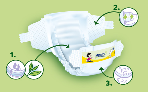 Der absorbierende Kern in MOLTEX Natur Nr. 1 besteht aus 100% chlorfreiem Zellmaterial (TCF). Gerüche werden von einem Teeblattextrakt absorbiert. Der dreilagige Absorber sorgt für eine schnelle Absorption der Flüssigkeit, die im absorbierenden Gel in MOLTEX-Natur Nr. 1 gespeichert ist. Das hält die Hautbereiche in Kontakt mit der Windel spürbar trocken.