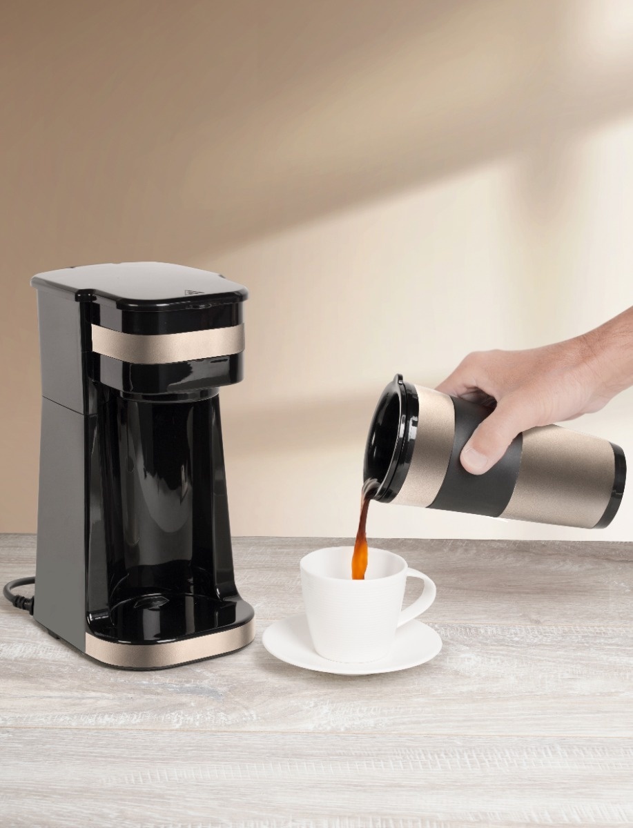 • Kompakte und praktische Kaffeemaschine mit verschließbarem Edelstahl-Thermobecher für unterwegs • Kapazität ca. 420 ml, reicht für 2 große Tassen Kaffee • Auch geeignet für Camping • Herausnehmbarer Filtereinsatz • Mit Permanentfilter • Ein/Aus-Taste mit Kontrollleuchte • Abschaltautomatik nach Brühende