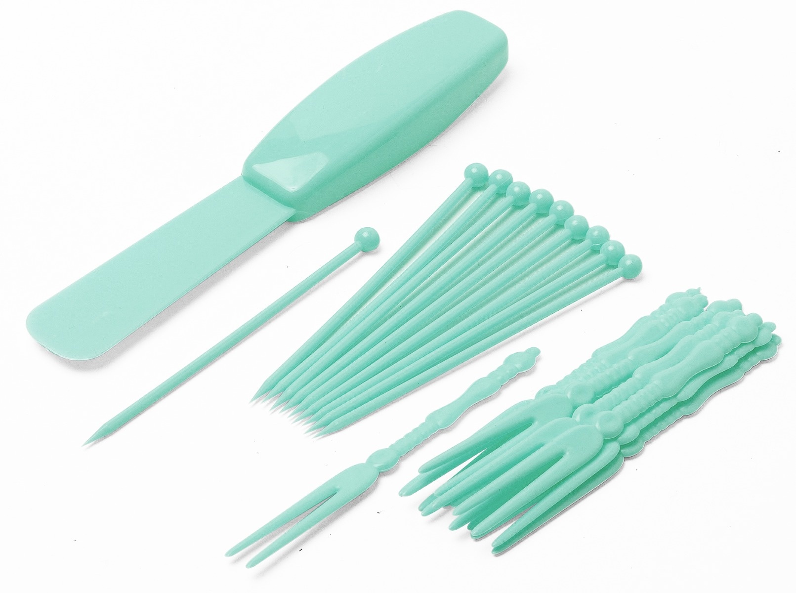• Mit 10 Kunststoff Spießen, 10 Gabeln und 1 Spatel