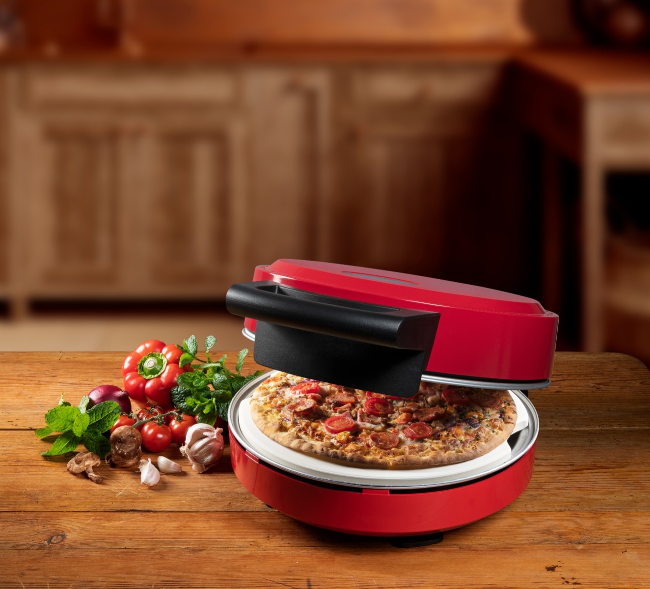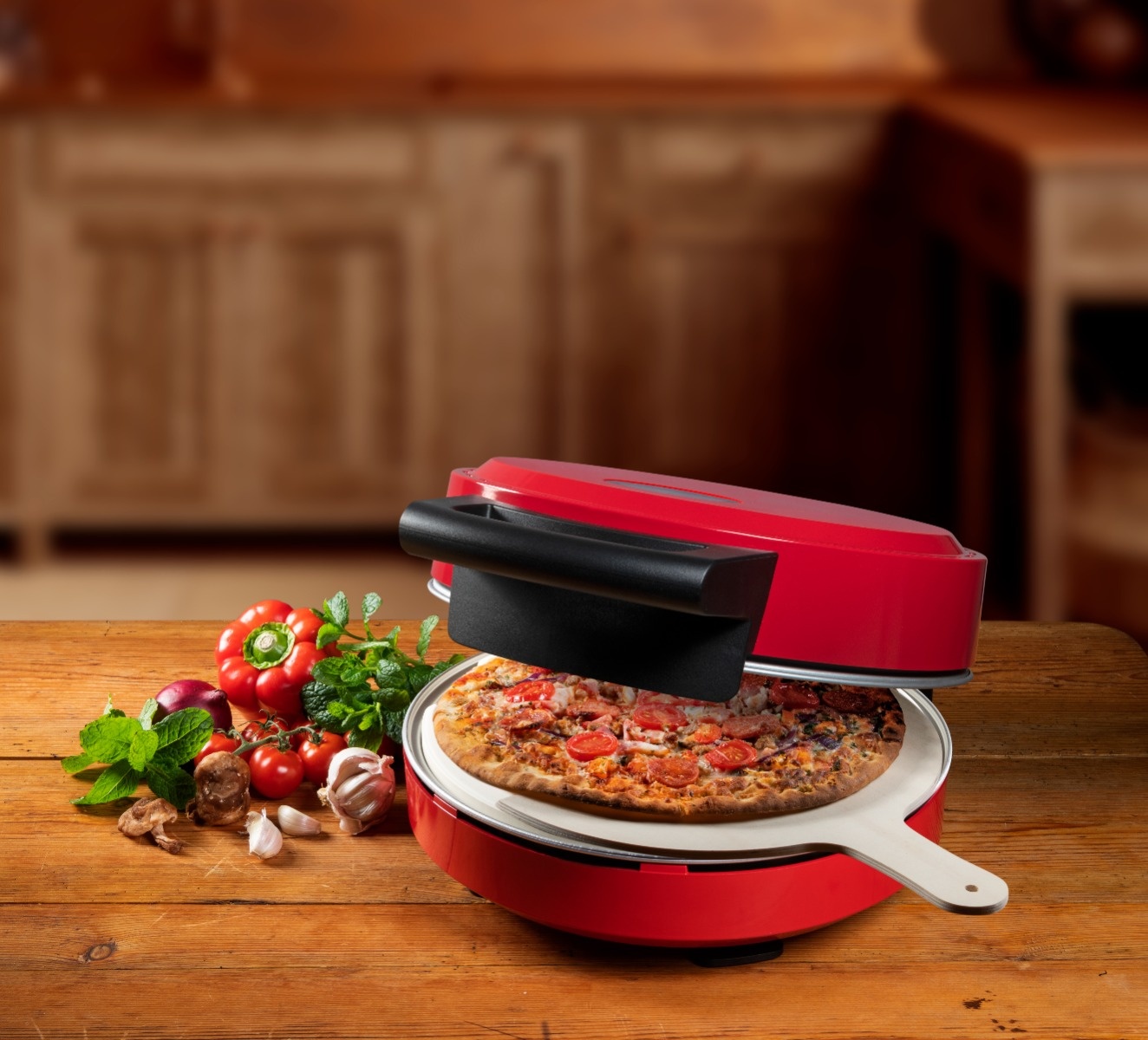 • Steinofen zur Zubereitung leckerer gefrorener und frischer Pizzen in nur 5–10 Minuten • Einfach austauschbarer Ofenstein (Ø +/- 32 cm) für eine einzigartig knusprige Pizzakruste • 2 reflektierende für Ober- und Unterhitze: Ihre Pizza wird schnell und gleichmäßig erhitzt • Einstellbarer Timer bis 30 Min. und einstellbare Temperatur (max. 320° C) • Inklusive 2 praktischen Pizzaspateln aus Holz!