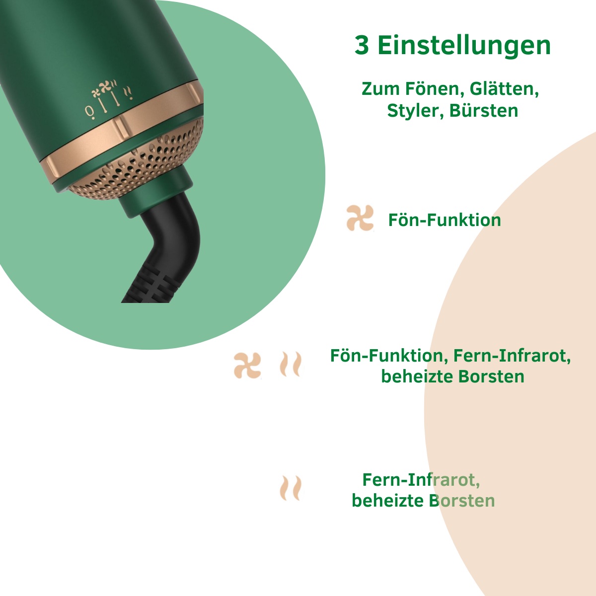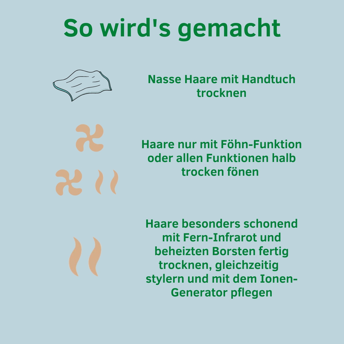 SO WIRD’s GEMACHT: Trocknen Sie Ihr Haar mit einem Handtuch. Danach föhnen Sie Ihr Haar, trocknen es aber nicht vollständig. Die Ferninfrarot-Wärme und die beheizten Borsten trocknen Ihre Haare auf besonders schonende Weise fertig. So vermeiden Sie bei der täglichen Anwendung zu viel Hitze für Ihr Haar. Gleichzeitig können Sie Ihre Haare stylen und der Ionen-Generator sorgt für Pflege.