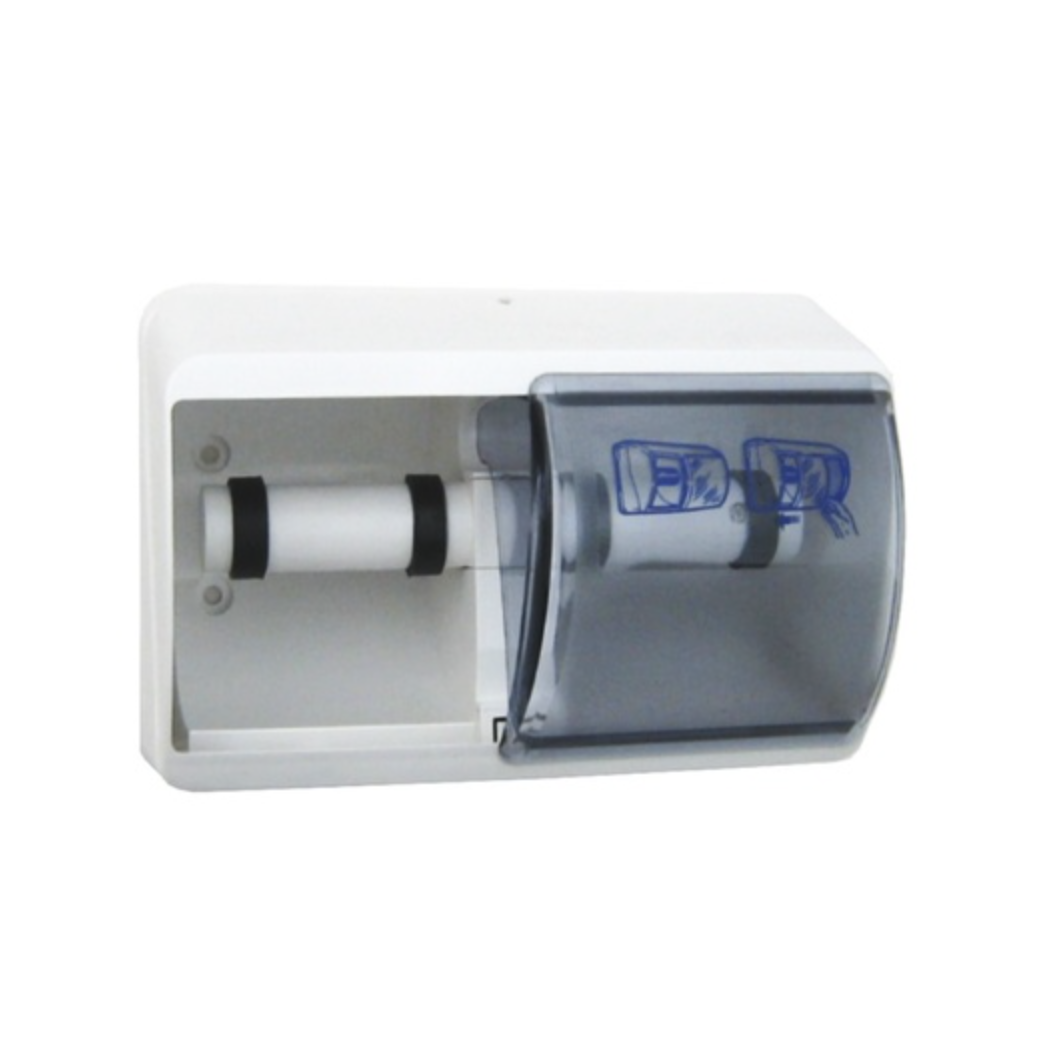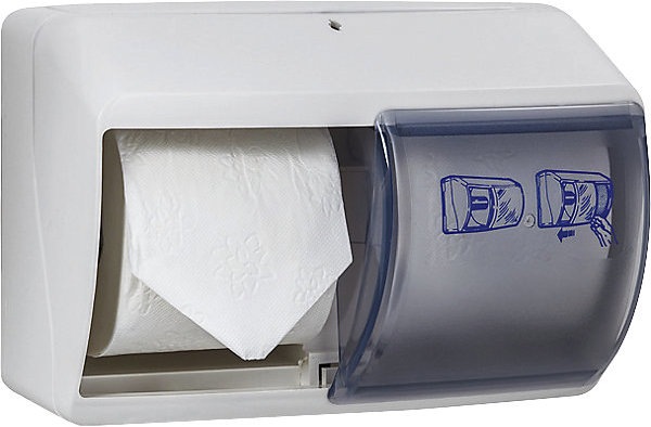 Eigenschaften - Toilettenpapierspender für 2 Rollen - Besonders stabiles Gehäuse aus Kunststoff - Abschliessbar - Farbe: weiss mit blauem Sichtfenster - BxHxT: 25.7 x 17.5 x 15.5 cm