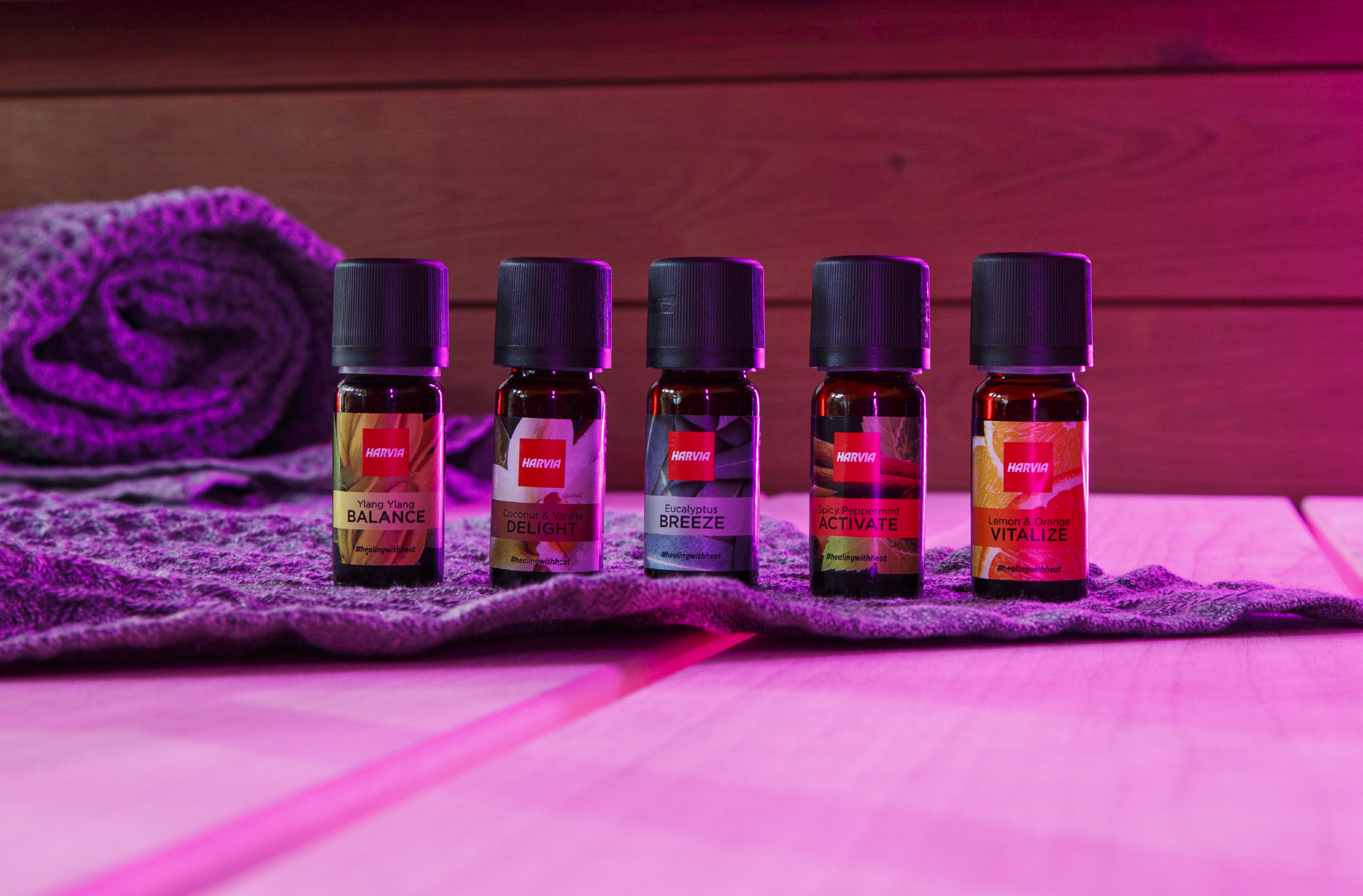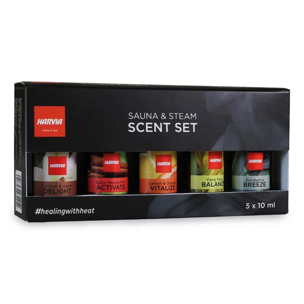 Das Harvia Healing with Heat Sauna- und Dampfduft-Set enthält fünf verschiedene 10-ml-Düfte. Die Düfte können verwendet werden, indem sie ins Wasser gemischt werden (das auf die heißen Saunaofensteine gegossen wird) und direkt auf die Oberflächen, die für die Verdampfung von Duftstoffen vorgesehen sind, wie z.B. Aufgussschalen.