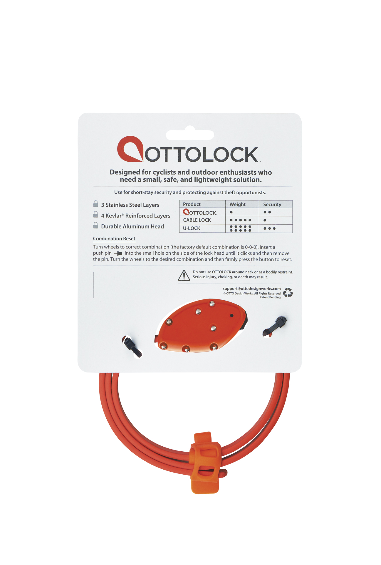 Trotz der guten Sicherungseigenschaften ist das kompakte Schloss sehr leicht, lässt sich flexibel zusammenrollen und passt so mit seinen geringen Abmessungen gut in Trikot- und Satteltasche. Kein unnötiger Schlüssel zum Öffnen (der gerne verloren wird). Einfach mit individuell einstellbarem Zahlencode auf Länge einrasten lassen -fertig. Mit dem cleveren Ottolock-Gurt gibt es keinen Grund, dein Fahrrad nicht zu sichern. Er ist der ideale Begleiter für 1001 Gelegenheiten.